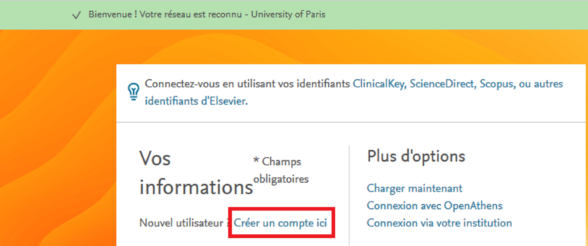 Si vous vous connectez à ClinicalKey pour la première fois, vous devez créer un compte personnel en utilisant votre adresse universitaire @u-paris.fr ou @etu.u-paris.fr.