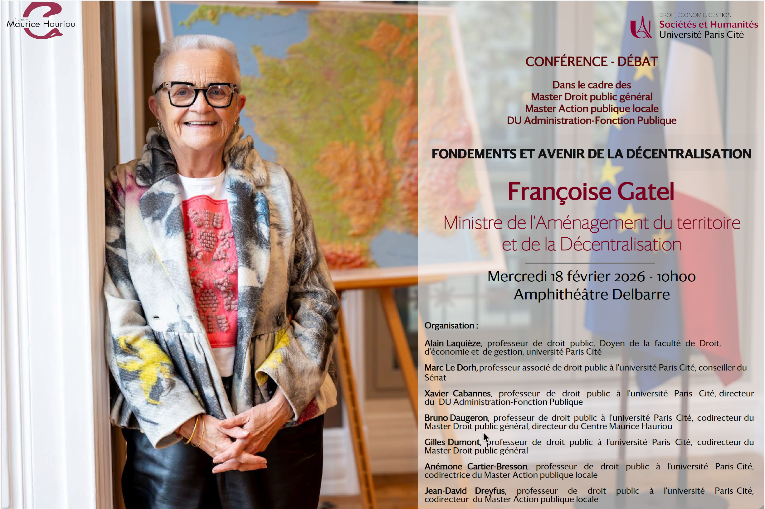 La Faculté de Droit, d’Économie et de Gestion de l’Université Paris Cité, dans le cadre des formations du Master Droit public général, du Master Action publique locale et du Diplôme universitaire Administration-Fonction Publique, et le Centre Maurice Hauriou pour la recherche en droit public et sciences politiques, ont l’honneur d’organiser une conférence-débat intitulée : « Fondements et avenir de la décentralisation »