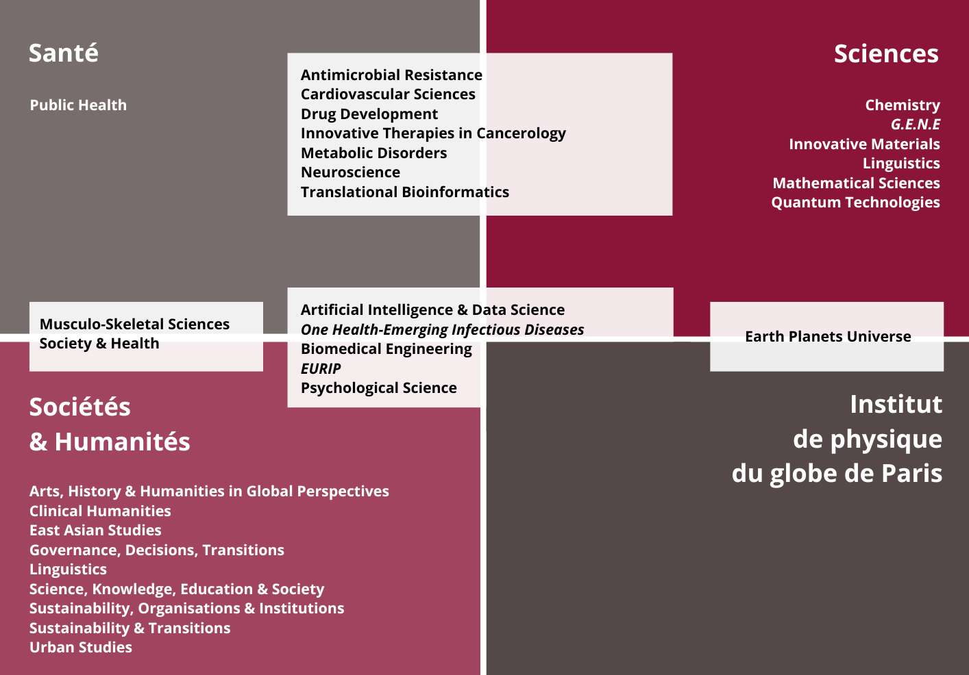 En rassemblant les unités de recherche, les réseaux interdisciplinaires et les initiatives pédagogiques innovantes, elles continueront de renforcer l’articulation entre recherche et formation, de développer une véritable culture de l’interdisciplinarité, et d’attirer les meilleurs profils internationaux au sein de notre université.